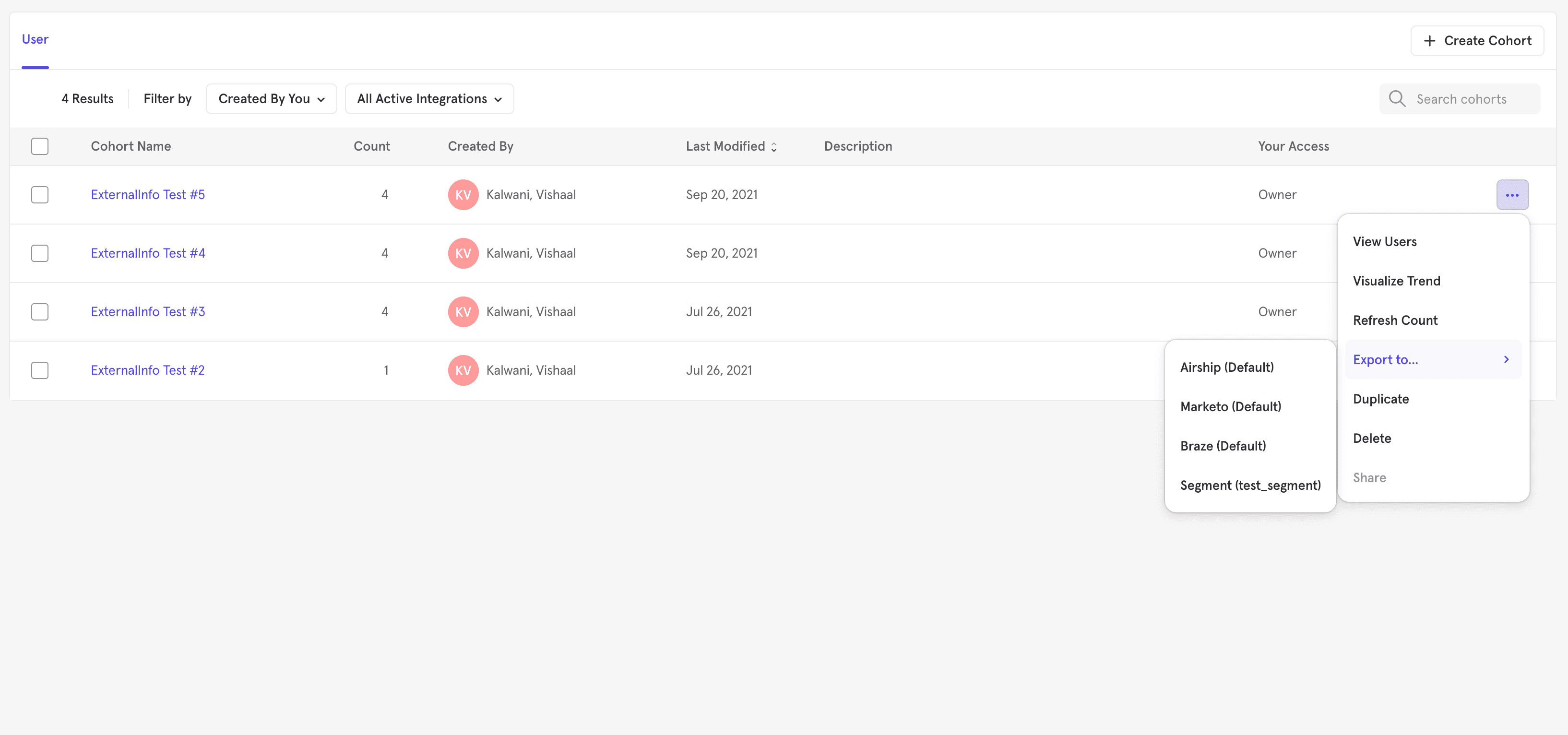- Select the cohort to send to Braze. Select Export to Braze. If you have multiple Connections, they will be differentiated by the Connection Name in the parentheses after the Integration Name.